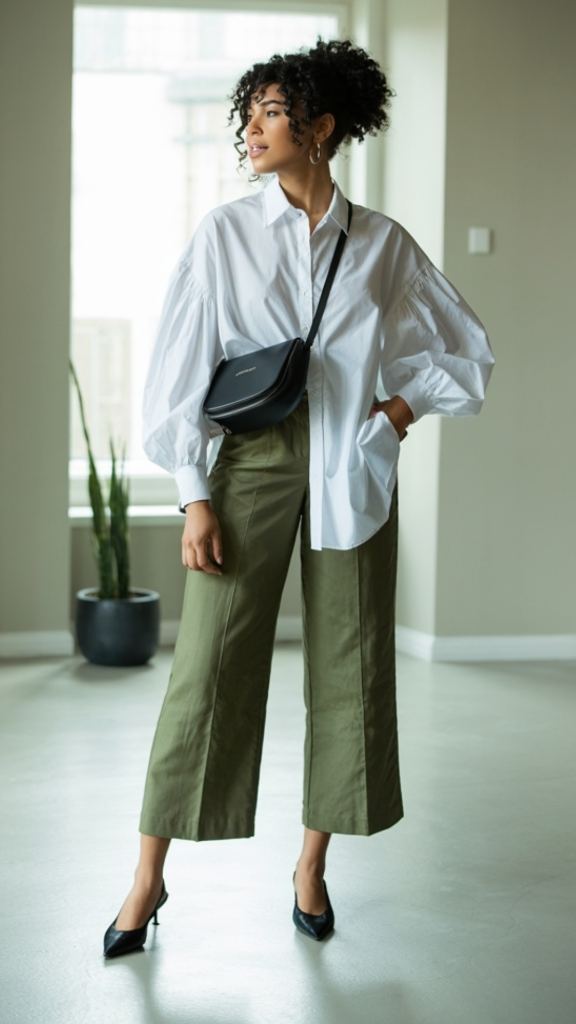 There’s a certain drama to this look that I absolutely live for, and it’s all in the proportions. That white balloon-sleeve shirt has the most gorgeous volume — it almost looks sculptural — and when paired with cropped olive culottes, it creates this striking silhouette that’s modern, artistic, and incredibly chic. The whole thing reads like it belongs in a Scandinavian design magazine, which is about the highest compliment I can give an outfit.