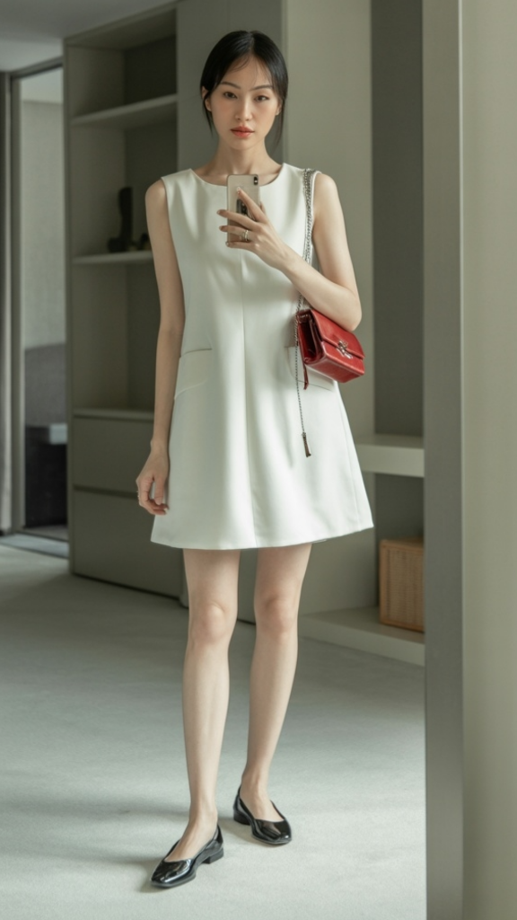 There’s something about a perfectly cut white dress that just stops me in my tracks every single time. This sleeveless A-line silhouette is the definition of refined classy summer outfits — it’s architectural without being rigid, minimal without being boring. The clean neckline, the subtle pocket detailing, the way the skirt flares just enough to give you movement… it feels very 1960s mod meets modern minimalism. And in a crisp, true white? It practically glows against summer skin.