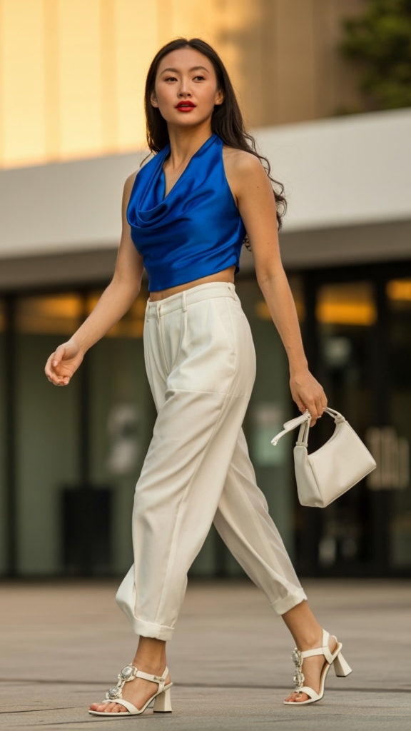 7. Royal Blue Satin Top with White Trousers — Sophisticated Summer Style