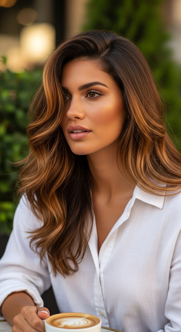 These warmer brunette tones are especially flattering in summer because they work beautifully with sun-kissed skin, golden undertones, and that slightly brighter makeup-and-wardrobe palette everyone gravitates toward once the weather heats up.