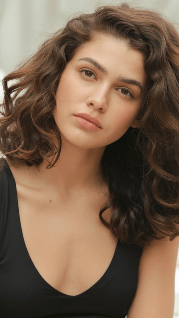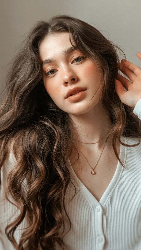 I love when the hair color and the overall beauty look tell the same story — and this one is telling a story of effortless cool. The soft, wavy brunette hair in a medium warm tone pairs perfectly with that sharp cat-eye liner, creating a look that’s equal parts relaxed and intentional. The color has a beautiful warmth to it — not quite caramel, not quite chocolate, but somewhere in that gorgeous in-between.