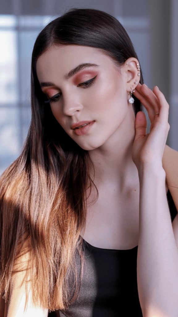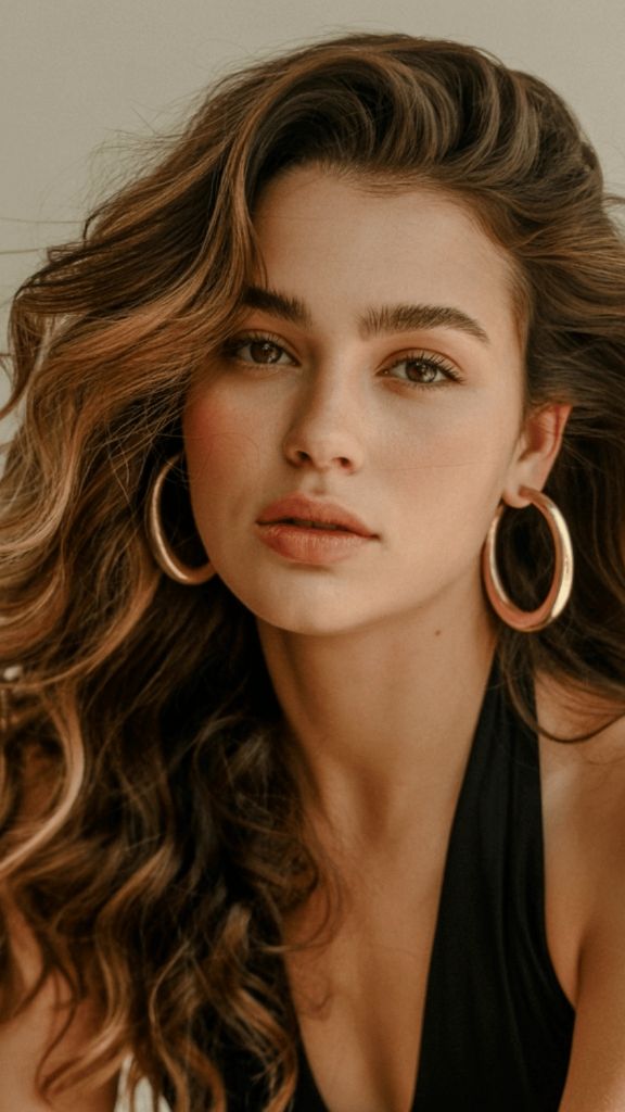 Glossy brunette hair is truly a category of its own, and this look takes it to another level. The deep, dark brunette base transitions into warm, golden-lit ends in a subtle ombre that looks like candlelight on silk. With the hair tucked behind one ear, showing off delicate pearl earrings, the whole aesthetic is refined and intentional — like someone who doesn’t try too hard because they don’t have to.