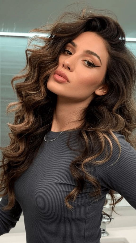 Oh, this is glamour. Capital G. These big, voluminous curls in a rich brunette balayage are serving old Hollywood energy with a summer 2026 twist. The dark base fades into warm, honeyed highlights that become most visible at the ends and around the face, and the volume here is absolutely dramatic in the best possible way. Winged eyeliner and this hair? Date night perfection.
