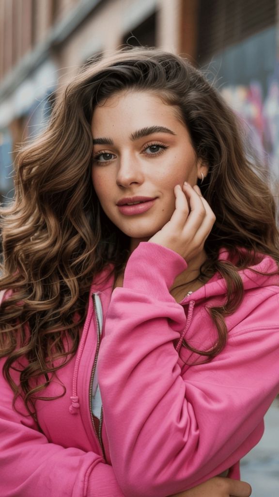 Not every summer brunette shade needs to be serious and sophisticated — sometimes you want hair that matches the energy of a bright pink jacket and a carefree attitude. This medium brunette with soft, sun-kissed highlights has a playful, youthful quality that just screams summer fun. The curly, slightly tousled texture gives it movement and personality, and the color is warm enough to look sun-drenched without tipping into territory that requires constant maintenance.
