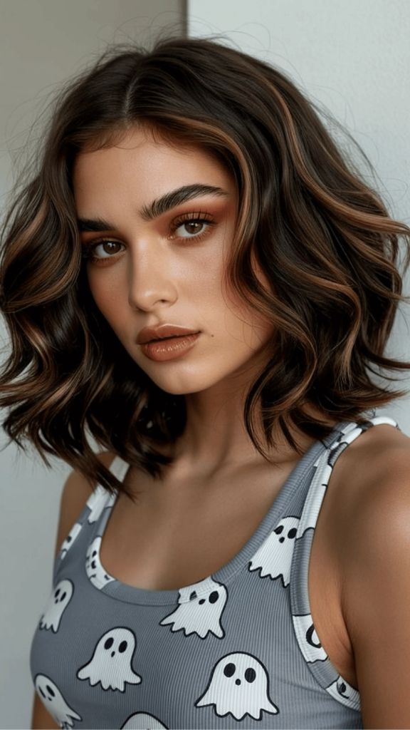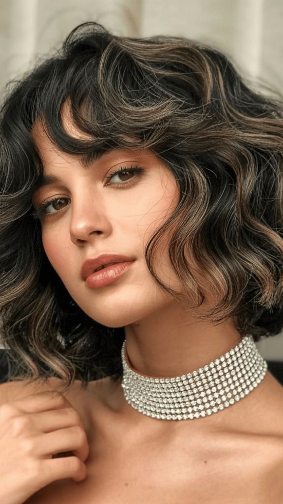 Now let’s talk about something a little moodier. If you’re a brunette who gravitates toward the darker side of the spectrum, this smoky balayage is everything. The dark base is almost espresso-black, with cool-toned, ashy highlights peeking through the waves. It’s sultry, it’s sophisticated, and it works beautifully with a shorter cut like this wavy bob. The diamond choker necklace aside — that hair is the real jewelry here.