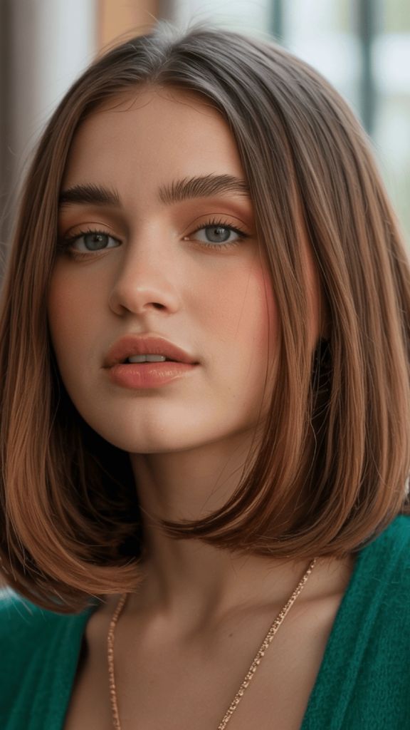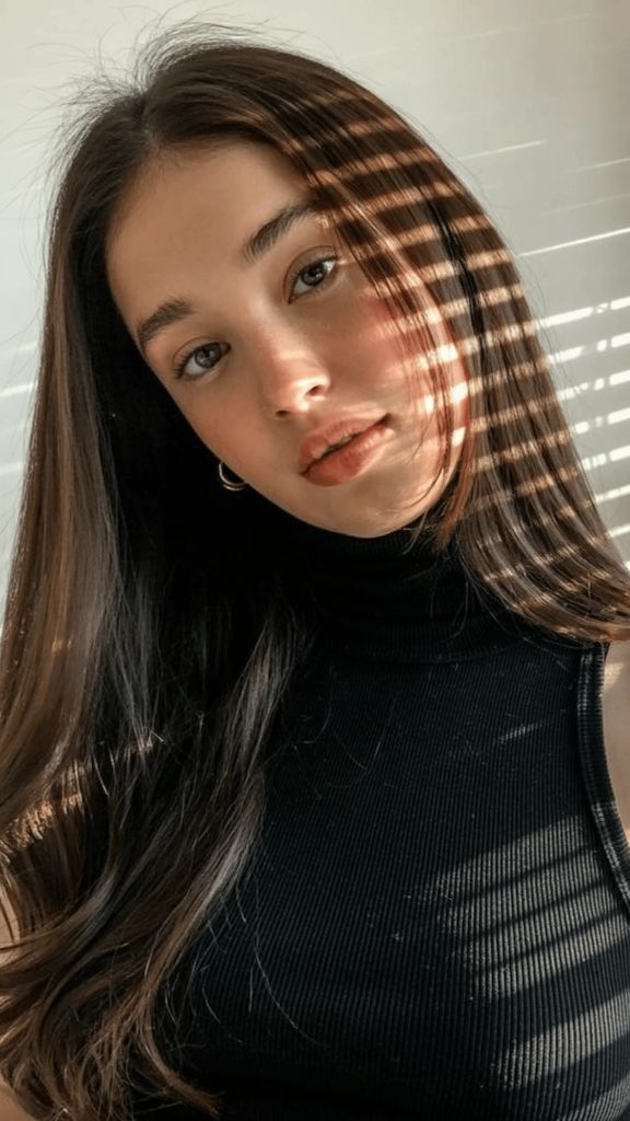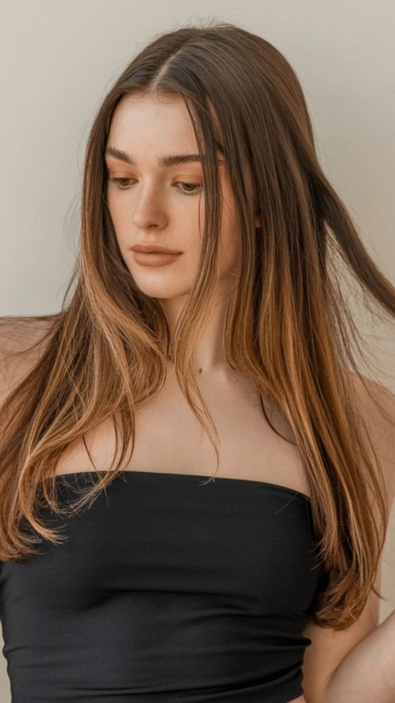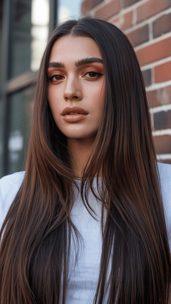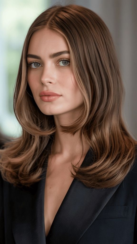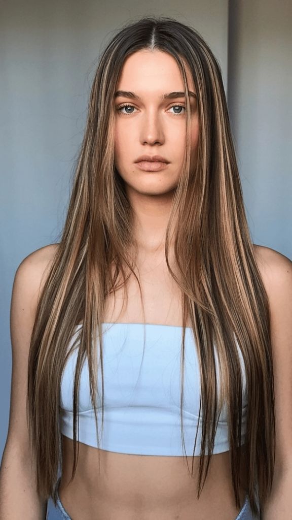 If “expensive hair” had a dictionary entry, this photo would be next to it. The subtle highlighted dimension running through this long, straight brunette hair is so seamless it almost looks like it was painted by sunlight. You can see whispers of golden blonde woven through a cool-toned medium brown base, and the overall effect is this luminous, almost ethereal quality. It’s editorial without trying too hard — which, in my opinion, is the hardest vibe to achieve.