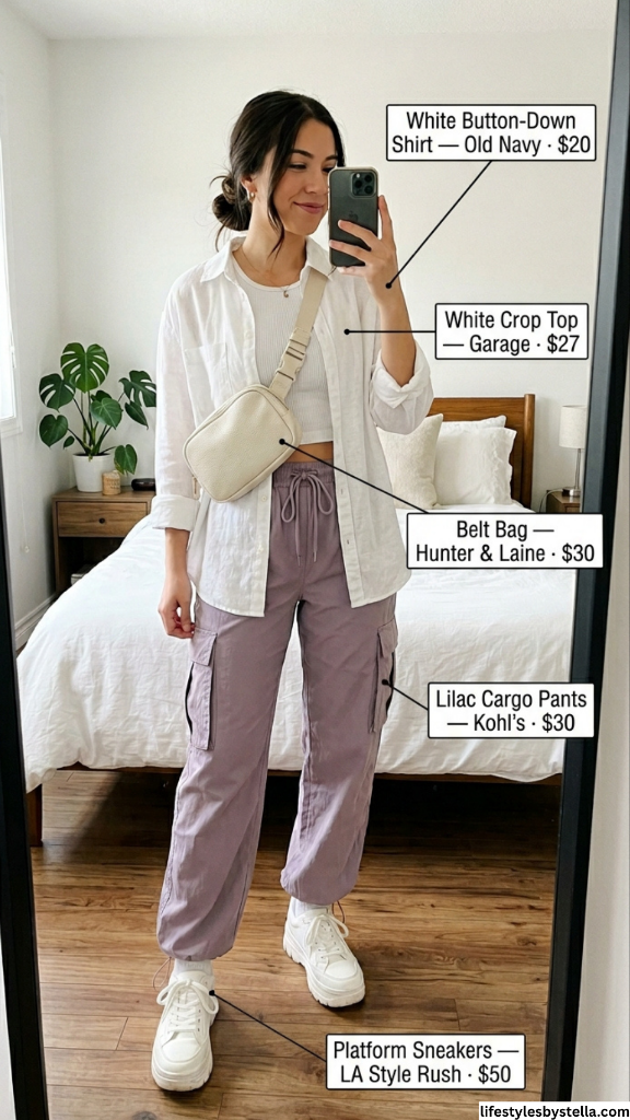 Shop This Look: The White Button-Down Shirt is from Old Navy at $20 — shop it here. The White Crop Top from Garage at $27 — find it here. The Belt Bag by Hunter & Laine for $30 — grab it here. The Lilac Cargo Pants from Kohl’s at $30 — get them here. And the Platform Sneakers from LA Style Rush at $50 — snag them here.