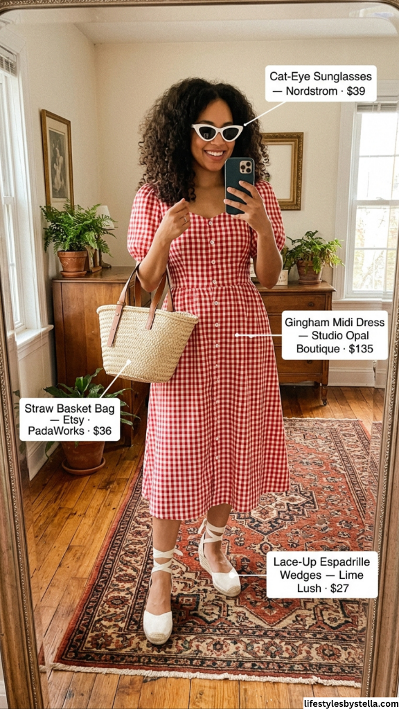 Shop This Look: The Gingham Midi Dress is from Studio Opal Boutique at $135 — shop it here. The Cat-Eye Sunglasses from Nordstrom at $39 — find them here. The Straw Basket Bag from Etsy · PadaWorks at $36 — grab it here. And the Lace-Up Espadrille Wedges from Lime Lush at $27 — get them here.