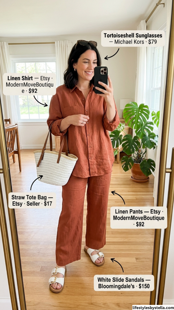 I’ve been waiting for the matching linen set trend to fully arrive, and this terracotta co-ord is everything I hoped it would be. The oversized button-down shirt and wide-leg pants from Etsy’s ModernMoveBoutique ($92 each) come in this rich, warm rust shade that looks like it was dipped in a Tuscan sunset. The linen has that perfectly rumpled, lived-in texture that gets better as the day goes on — none of that stiff, scratchy cheap-linen energy. It just breathes, which is exactly what you need when July hits 95 degrees.