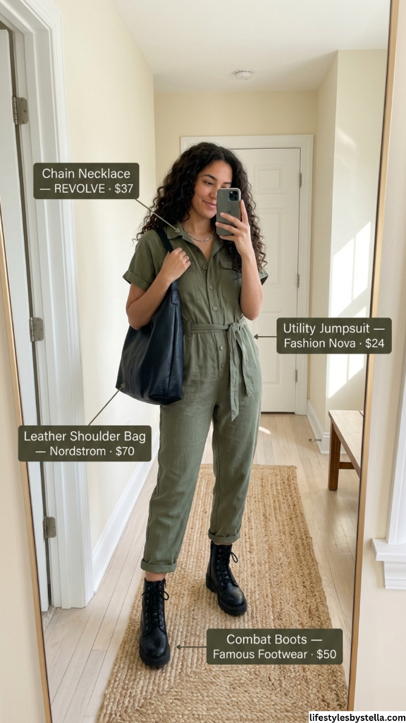 Shop This Look: The Utility Jumpsuit is from Fashion Nova at $24 — shop it here. The Combat Boots from Famous Footwear at $50 — find them here. The Leather Shoulder Bag by Nordstrom for $70 — grab it here. And the Chain Necklace from REVOLVE at $37 — get it here.