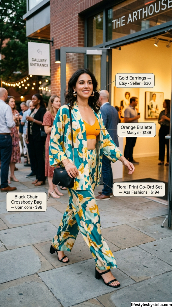 Now let’s talk about the outfit that makes you feel like a walking work of art. This floral print co-ord set from Aza Fashions ($194) features a bold teal, yellow, and cream print on a flowing kimono-style jacket and matching wide-leg pants. It’s a statement — full stop. The print is large-scale and unapologetic, and the way the fabric moves when you walk creates this billowy, almost ethereal effect that turns every sidewalk into a runway. Layered over a bright orange bralette from Macy’s ($139 — a luxe piece, but worth it for the quality), the color combination is fearlessly artistic.