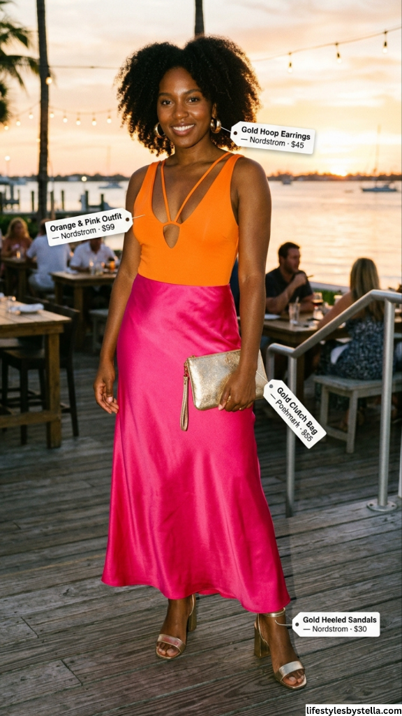 I’ll be honest — wearing orange and pink together takes a little courage. But once you see how the warm tones complement each other (especially on deeper skin tones, where they absolutely sing), you’ll wonder why you ever hesitated. This is statement summer styling at its finest.