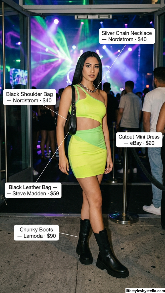 9. Neon Cutout Mini Dress with Chunky Boots — Bold Summer Outfit Ideas for Nightlife
