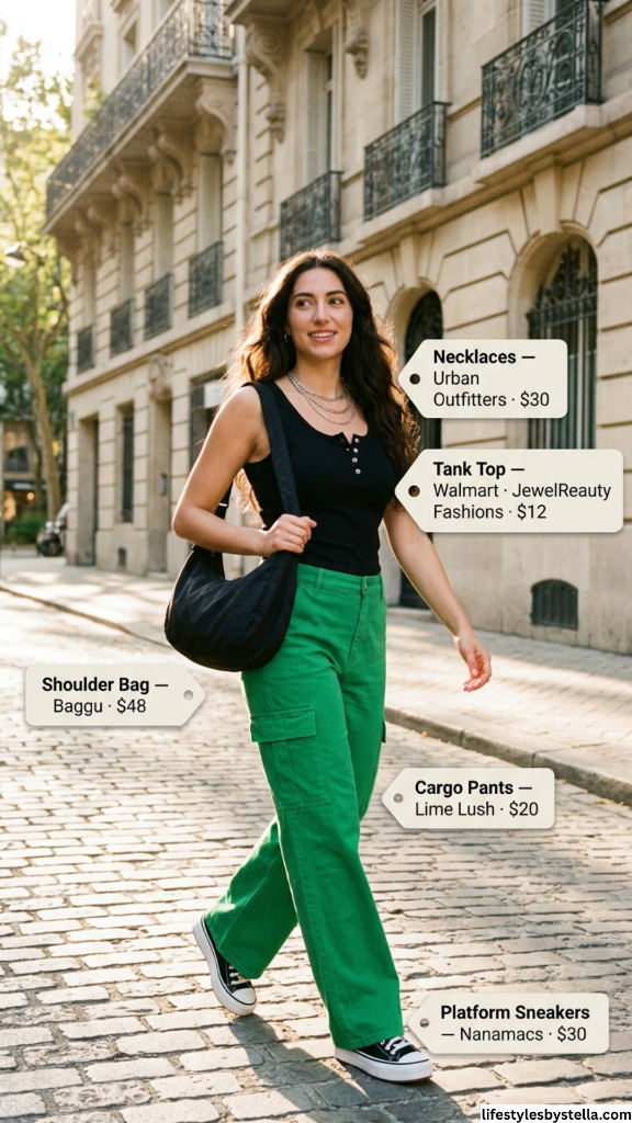 Shop This Look: The Tank Top is from Walmart · JewelReauty Fashions at $12 — shop it here. The Cargo Pants from Lime Lush at $20 — find them here. The Necklaces from Urban Outfitters at $30 — grab them here. The Shoulder Bag by Baggu for $48 — get it here. And the Platform Sneakers from Nanamacs at $30 — snag them here.