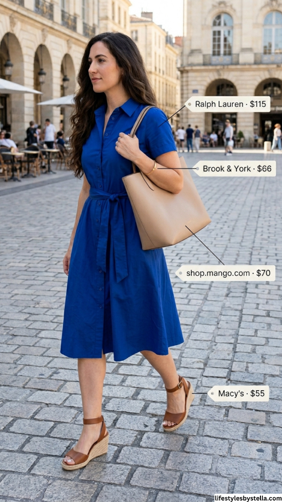 Shop This Look: The Blue Shirt Dress is from Ralph Lauren at $115 — shop it here. Alternatively, find a similar dress at shop.mango.com for $70 — see it here. The Tan Tote Bag from Brook & York at $66 — grab it here. And the Brown Wedge Sandals from Macy’s at $55 — find them here.