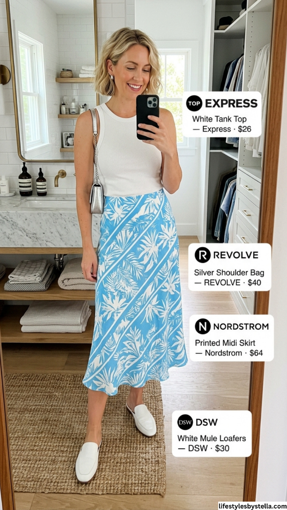 Shop This Look: The White Tank Top is from Express at $26 — shop it here. The Silver Shoulder Bag from REVOLVE at $40 — find it here. The Printed Midi Skirt by Nordstrom for $64 — grab it here. And the White Mule Loafers from DSW at $30 — get them here.