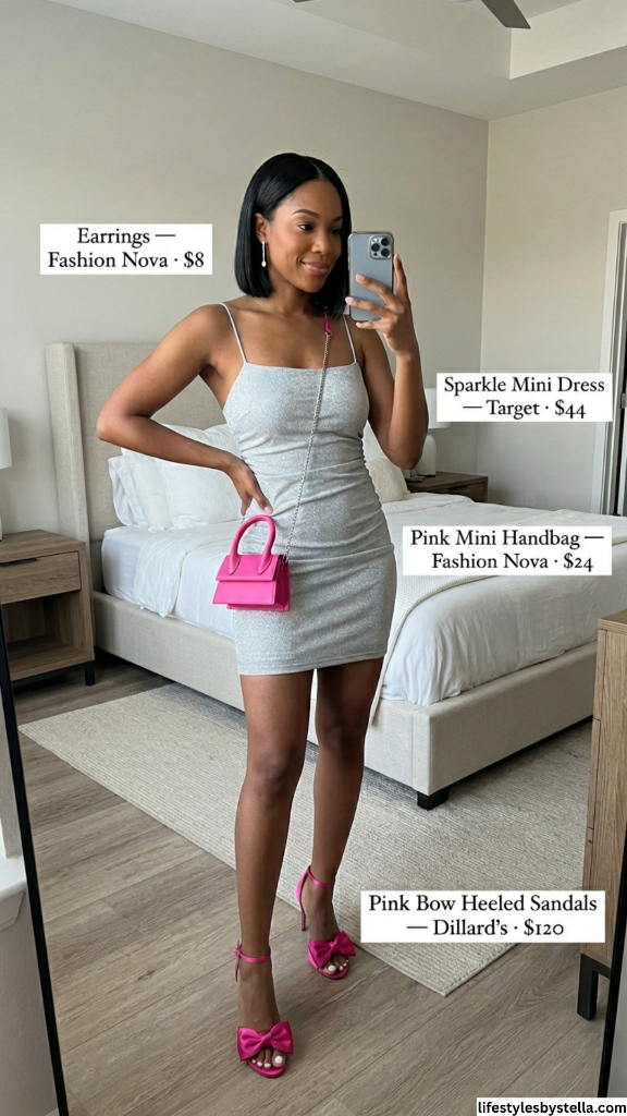 Now this is how you do a summer night out. The sparkle mini dress from Target — yes, Target, at $44 — has that subtle shimmer that catches every light in the room without being full-on disco ball. It’s a fitted spaghetti-strap silhouette in a neutral silver-grey that serves as the perfect canvas for accessories that absolutely go off. And these accessories? They go off. The hot pink bow heeled sandals from Dillard’s ($120) are a showstopper on their own, and paired with a matching pink mini handbag from Fashion Nova ($24), the whole look is cohesive, playful, and undeniably bold.