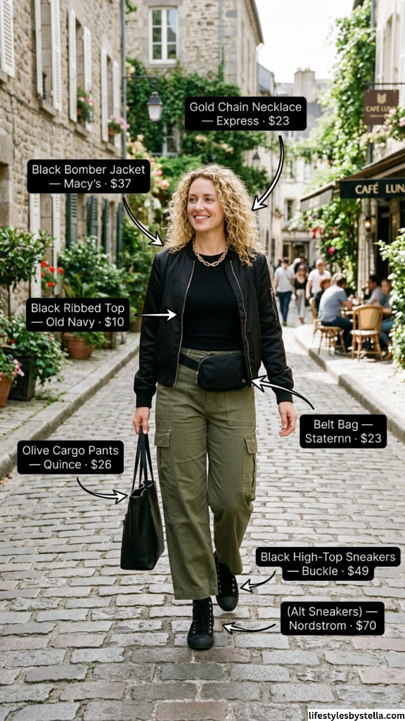 For those who prefer something moodier, this outfit is giving main-character-in-an-action-movie and I am here for it. The black bomber jacket from Macy’s ($37) layered over a black ribbed top from Old Navy ($10) creates this sleek monochrome upper half, while the olive cargo pants from Quince ($26) introduce that military-utilitarian contrast below. The whole look reads as confident, slightly androgynous, and very cool — especially walking down a cobblestone street with a tote in one hand and attitude in the other.