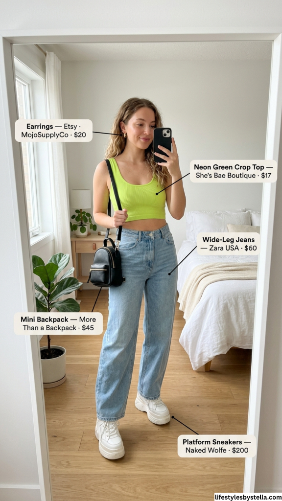 Shop This Look: The Neon Green Crop Top is from She’s Bae Boutique at $17 — shop it here. The Wide-Leg Jeans from Zara USA for $60 — find them here. The Platform Sneakers by Naked Wolfe at $200 — grab them here. The Mini Backpack from More Than a Backpack at $45 — get it here. And the Earrings from Etsy · MojoSupplyCo at $20 — snag them here.