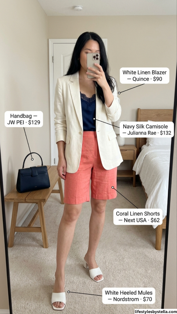Shop This Look: The White Linen Blazer is from Quince at $90 — shop it here. The Navy Silk Camisole by Julianna Rae for $132 — find it here. The Coral Linen Shorts from Next USA at $62 — grab them here. The White Heeled Mules are from Nordstrom at $70 — shop them here. And the Handbag by JW PEI at $129 — get it here.