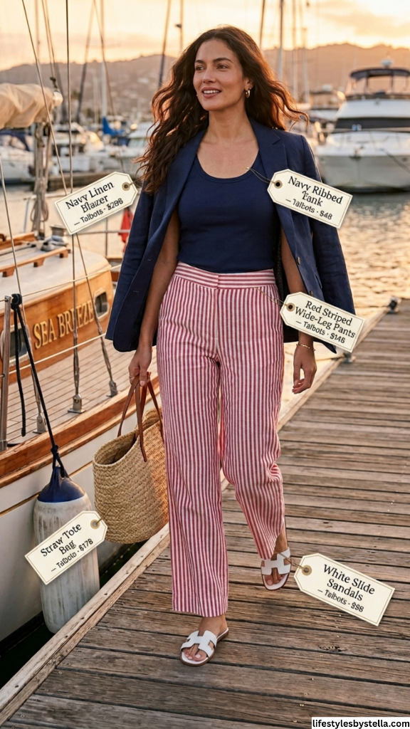 If coastal chic had a uniform, this would be it. The navy linen blazer from Talbots ($298) draped over a matching navy ribbed tank ($48) creates this elegant, streamlined upper half that transitions seamlessly into the real star of the show: red striped wide-leg pants ($145, also Talbots). The red and white vertical stripes have a nautical charm that feels timeless — like something Jackie O would have worn on a yacht in the ’60s — but the wide-leg silhouette and relaxed blazer styling keep it firmly planted in 2026.