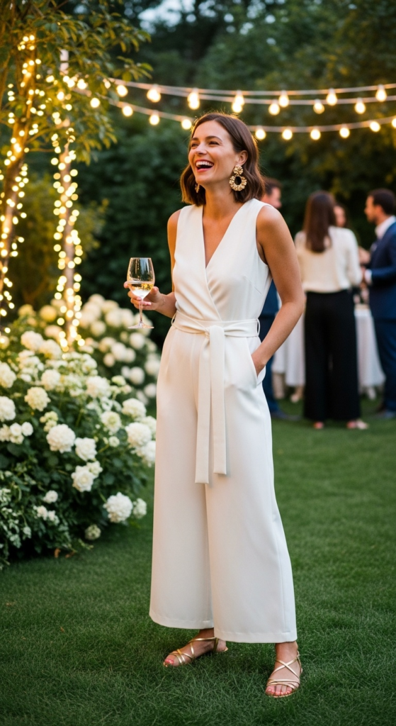 A white wrap-style or belted jumpsuit is ideal for daytime parties because it has structure. That structure matters when you’re wearing one color head to toe. It keeps the outfit from feeling too floaty or shapeless.