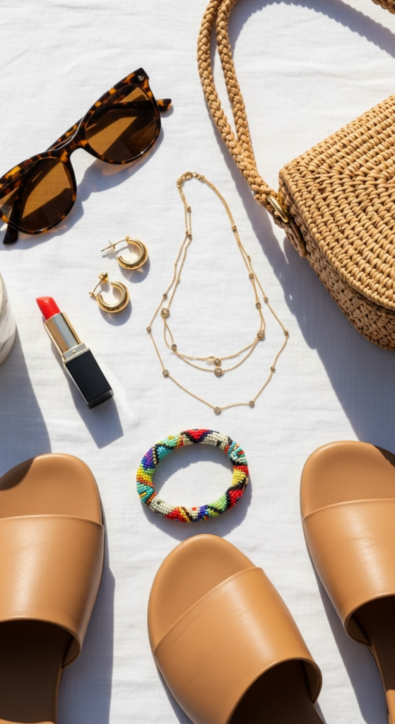 Gold huggie hoops, tortoiseshell sunglasses, a straw crossbody, and tan leather sandals all work beautifully because they warm up the white without competing with it. If you want even more ideas for what shoes work best with summer whites, you’ll love my roundup of summer shoes 2026 trends worth trying.