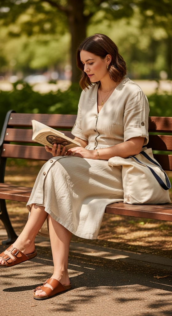 Alt text suggestion: Casual plus size summer outfits with an oatmeal linen button-front midi dress, leather sandals, and minimal gold jewelry in a sunny park.