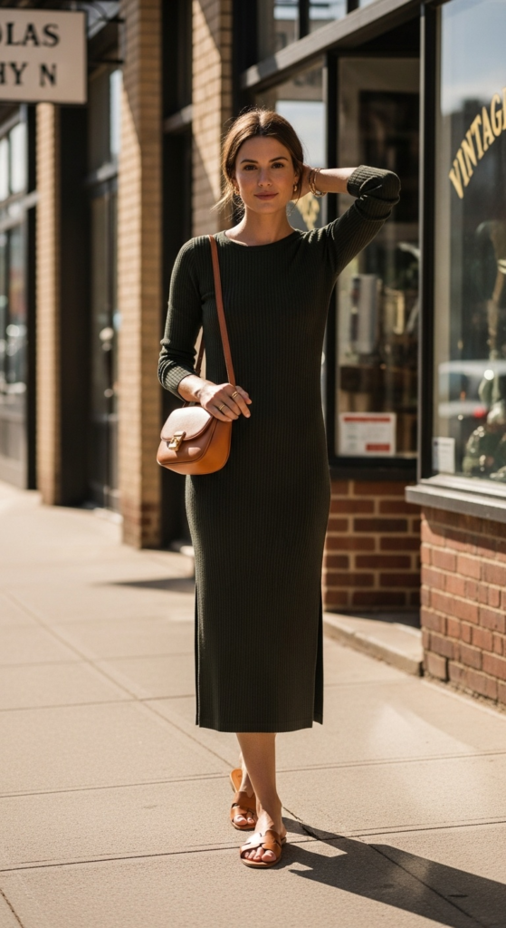 Alt text suggestion: Casual summer dress trends 2026 column dress in dark olive ribbed knit outside a vintage shop