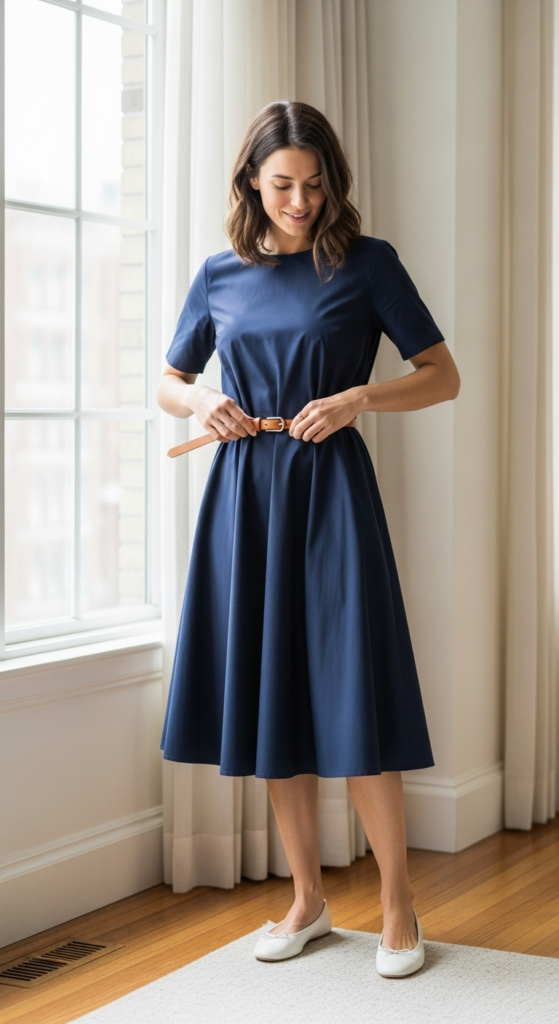 A washed cotton poplin dropped-waist dress with a gentle A-line skirt feels effortless rather than overwhelming. It sits lower on the body, creates a looser line, and often feels far more comfortable than tightly defined waist styles.