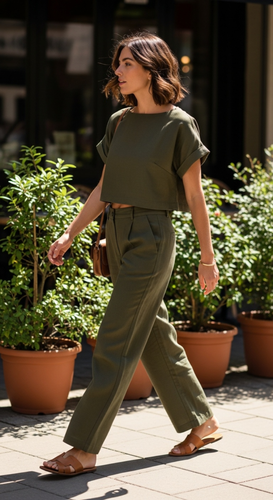 My first set was an olive co-ord with a cropped boxy top and wide-leg pants. Since then, it has gone everywhere with me. I’ve worn it to work with a blazer over my shoulders. I’ve worn it to the farmer’s market with sneakers. I’ve worn it to dinner with heeled mules and a stronger lip color. It adapts based on the accessories, which is exactly what makes it worth the closet space.