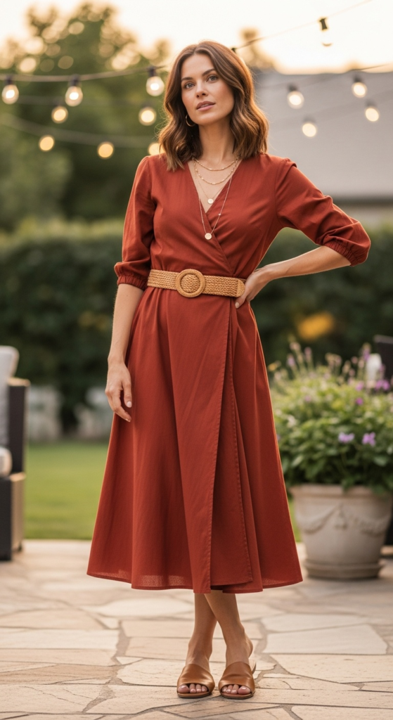 Chic hot weather outfits idea featuring a rust cotton midi wrap dress with tan slides at golden hour