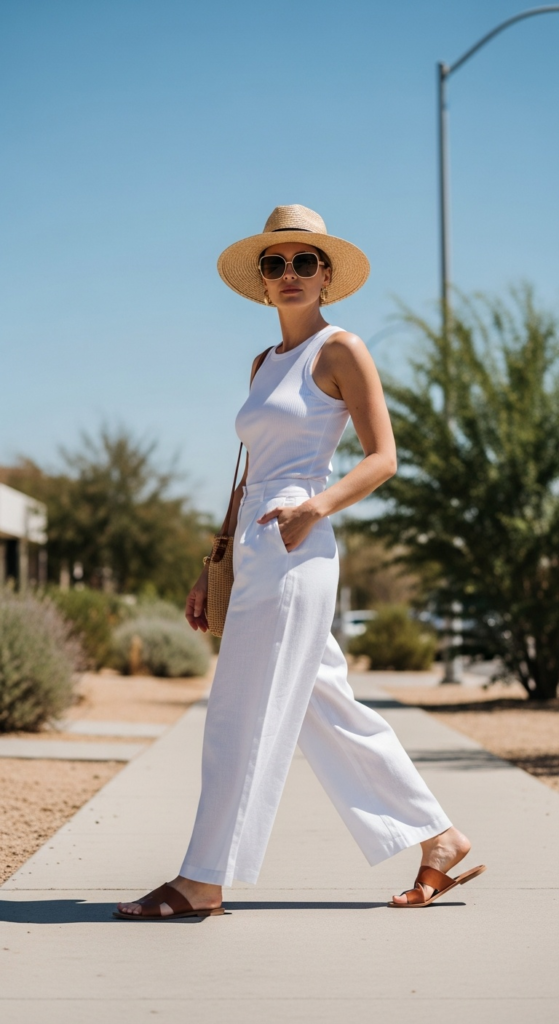 This is why chic hot weather outfits work so well when they are stripped back to essentials. A white tank, wide-leg trousers, flat sandals, a straw hat, and good sunglasses can look more editorial than a far more complicated look.