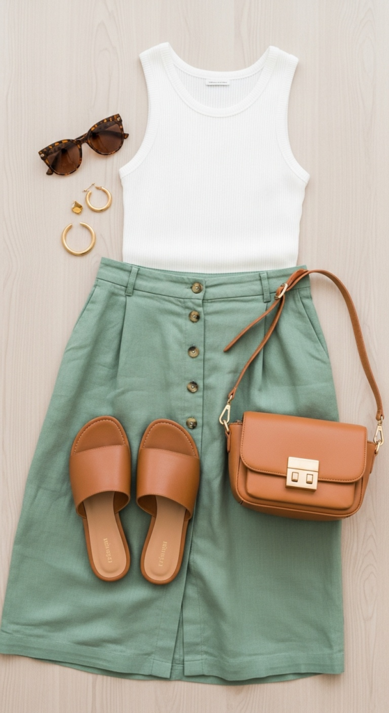 Chic hot weather outfits flat lay with sage skirt, white tank, tan sandals, sunglasses, and gold hoops