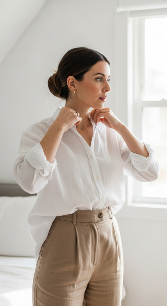 Chic hot weather outfits idea with oversized white linen shirt and tan linen trousers in a bright bedroom
