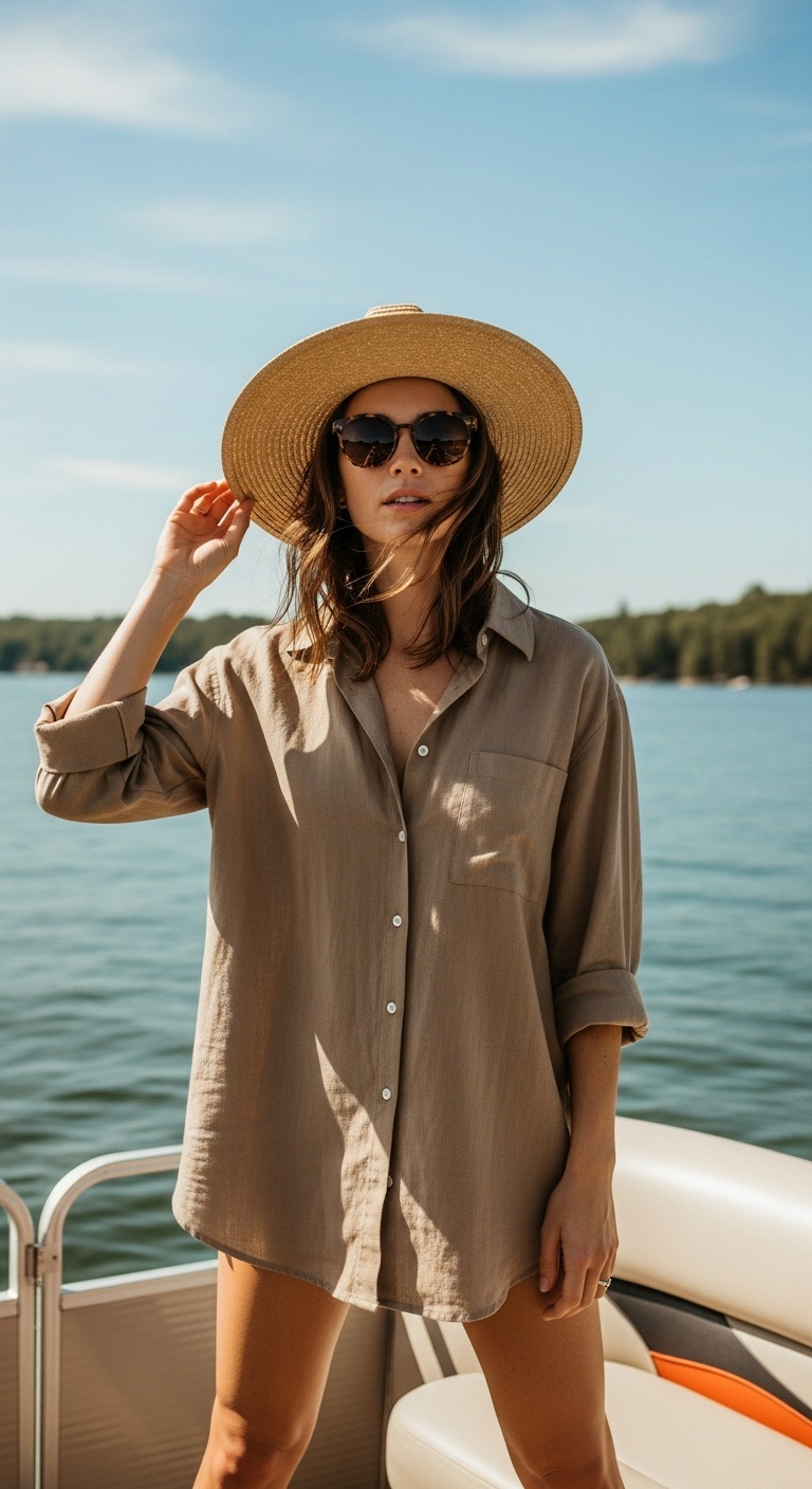 Suggested alt text: Cute boat outfits for women featuring an oversized oatmeal linen shirt, straw hat, and sunglasses on a pontoon boat