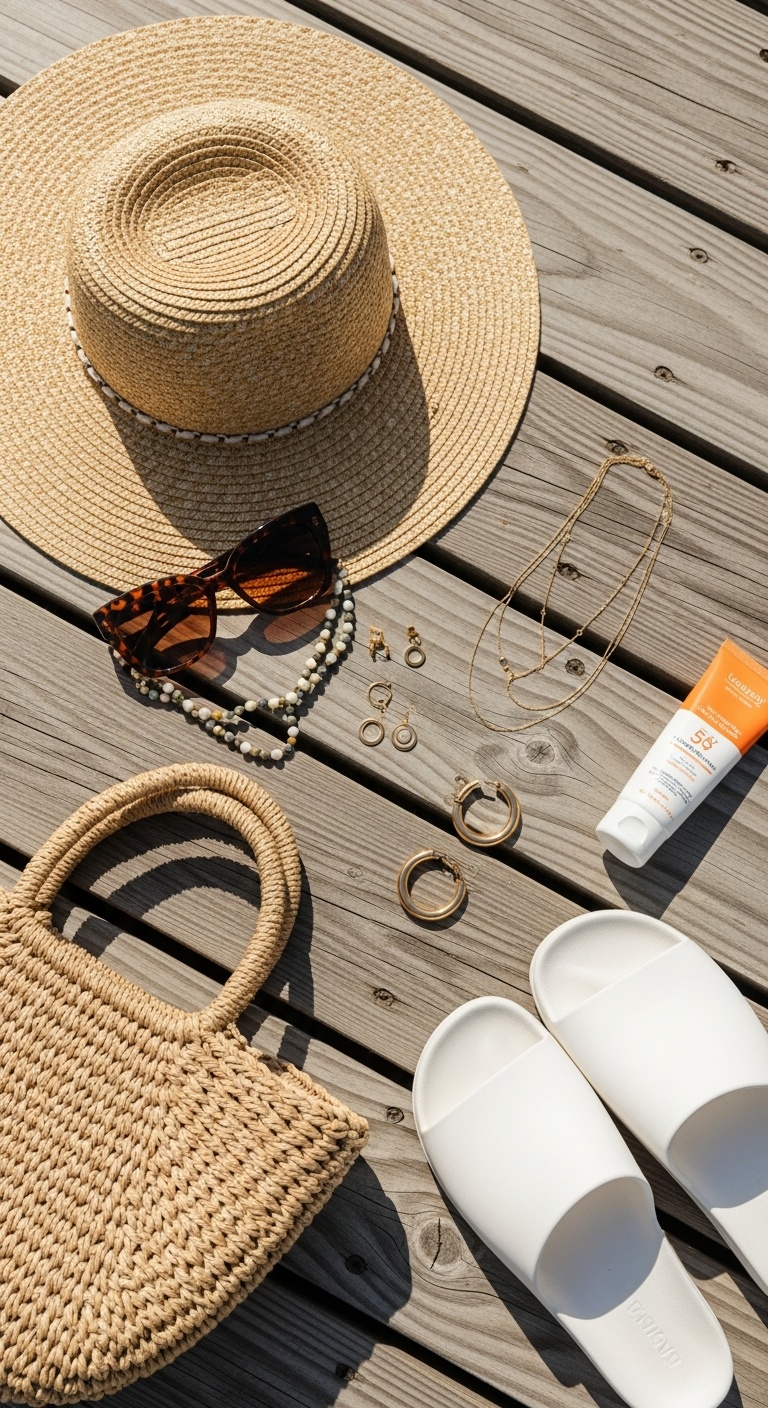 Suggested alt text: Cute boat outfits for women accessory flat lay with straw hat, sunglasses, woven tote, sunscreen, and white rubber slides