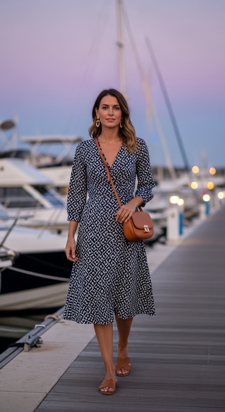 A wrap dress in a breathable, wrinkle-friendly fabric is one of the easiest cute boat outfits for women when you know the day will stretch into night. It looks feminine and flattering, but it still feels comfortable enough for a boat.