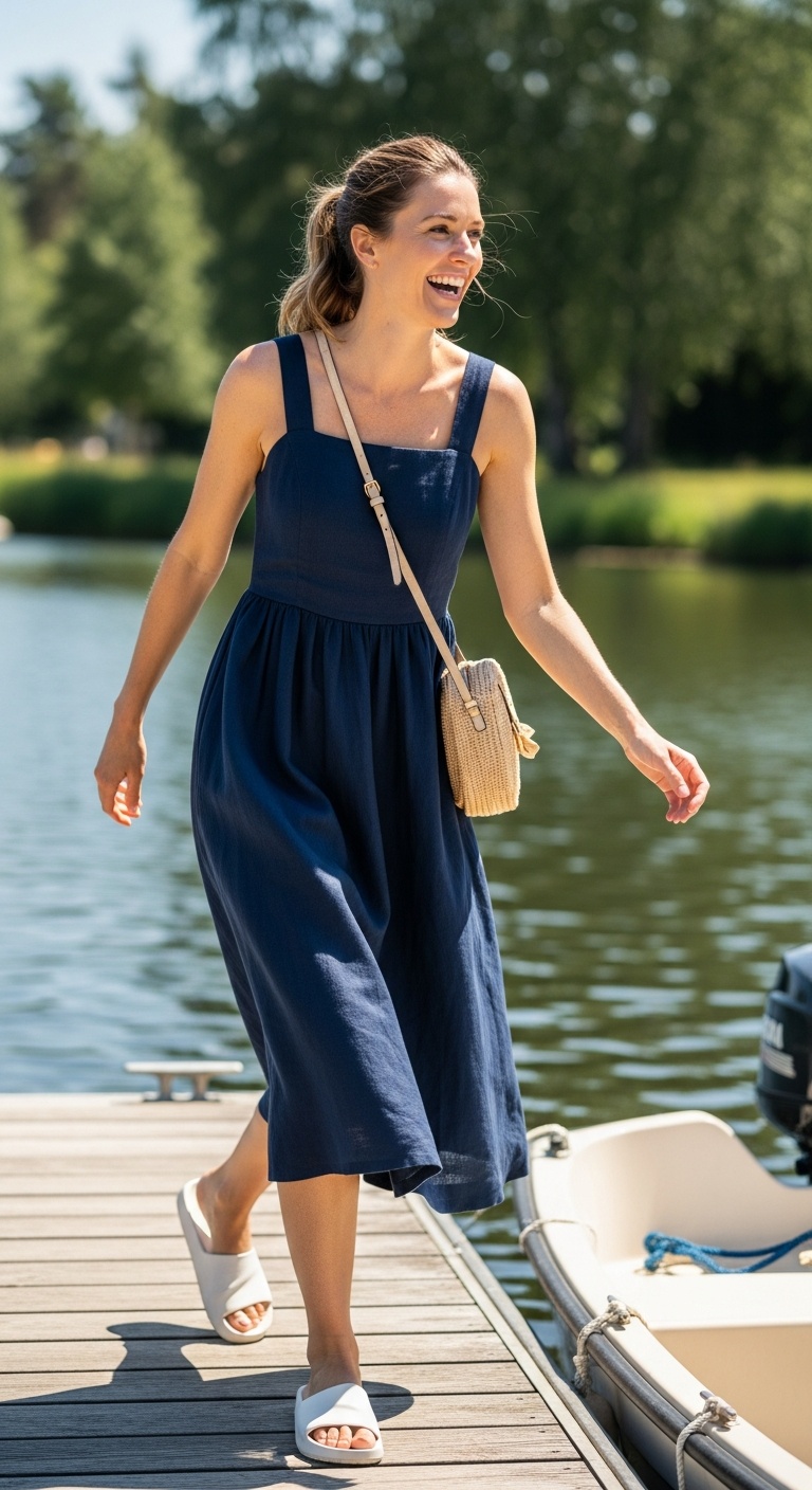 Suggested alt text: Cute boat outfits for women featuring a navy linen midi dress and white slide sandals while stepping onto a boat