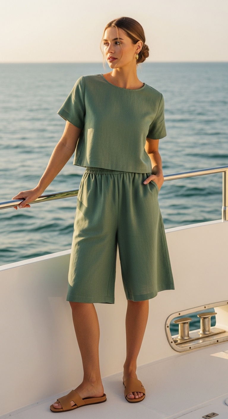 A linen co-ord works because it checks every box. It feels cool in the heat, dries faster than heavier fabrics, and still looks elevated when you step off the boat. It is also incredibly easy to accessorize. Flat leather sandals, simple hoops, and a soft straw tote are enough.