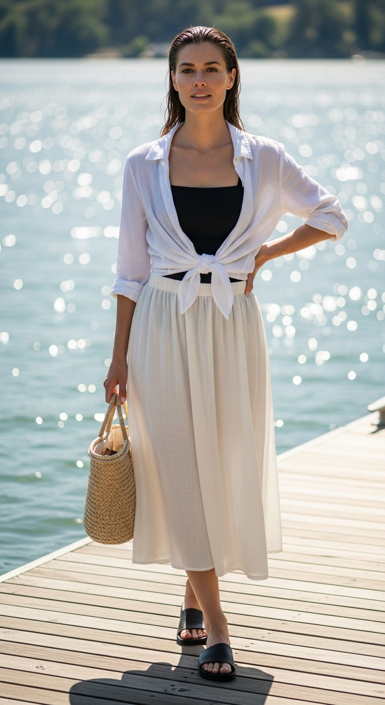 Suggested alt text: Cute boat outfits for women with a black one-piece swimsuit, white gauzy shirt, and cream midi skirt by the lake