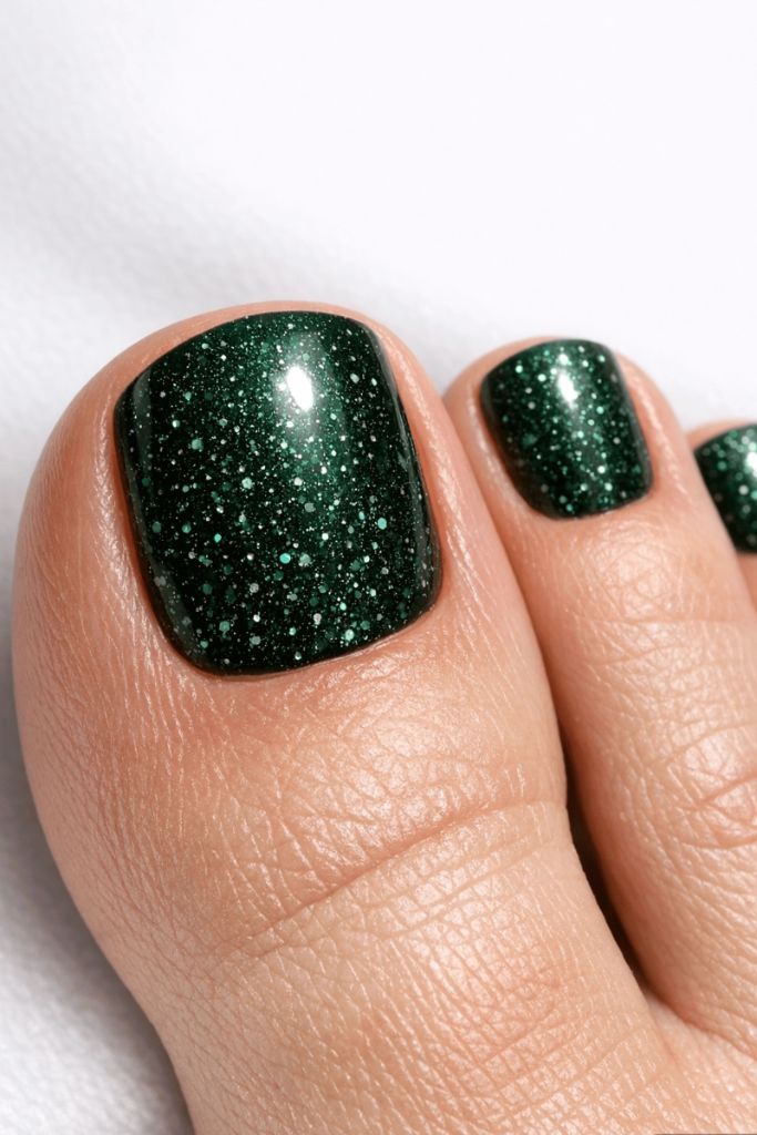 2. Dark Emerald Glitter Spring Pedicure with Sparkling Depth