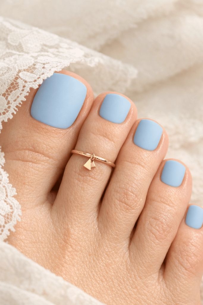 I’ve been absolutely captivated by matte pastels for pedicures this season, and this baby blue is a masterclass in the trend. The matte finish transforms what could be a simple, predictable pastel into something with real depth and texture — it looks like a pale sky pressed onto each nail, soft and velvety and impossibly smooth. The dainty gold toe ring with its tiny charm pendant adds just enough contrast to make the whole look feel curated rather than casual.