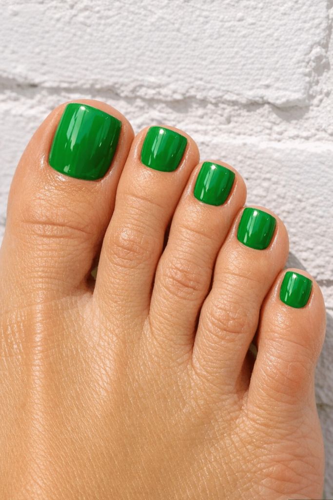 Bright greens have been steadily climbing the trendy toe nail colors list for 2026, and this particular shade — a true, balanced green without yellow or blue leaning — is the most wearable version of the trend. It works surprisingly well with both warm and cool-toned skin because it sits right at the center of the green spectrum. Style it with white sneakers for a sporty daytime look, or with black strappy sandals for evening contrast. Either way, your toes become the focal point.