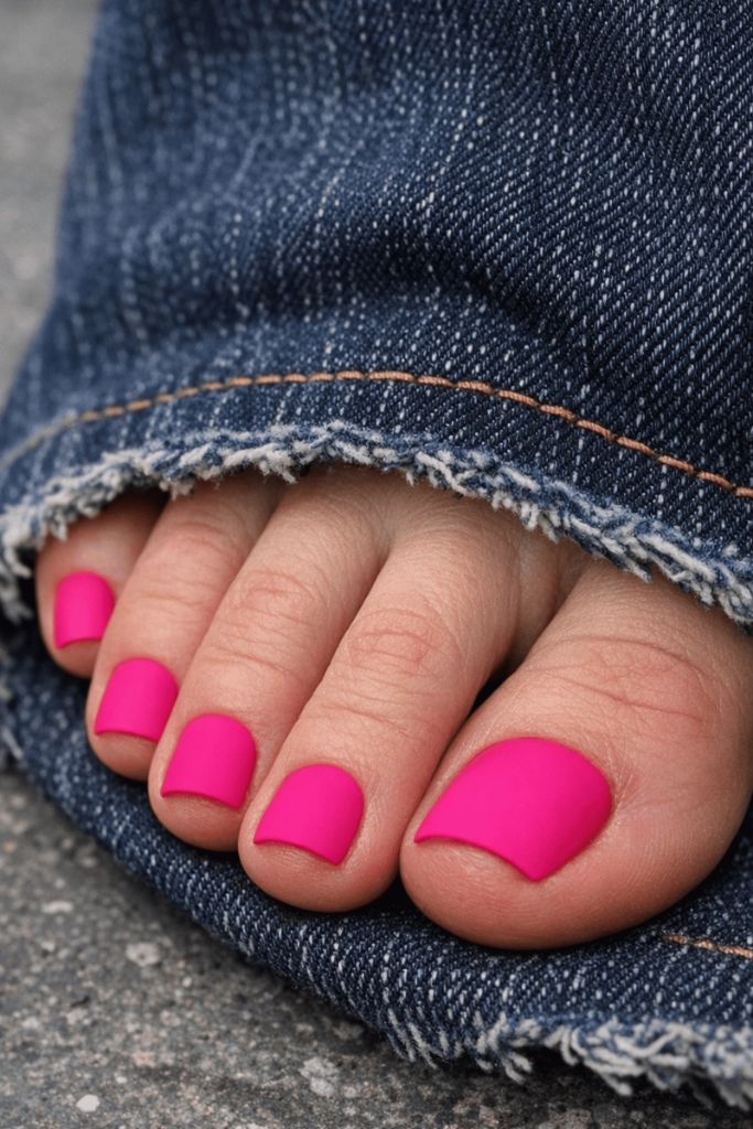 Now let’s talk about a pedicure that has genuine attitude. This matte neon pink is so saturated, so vivid, that it almost looks like it’s been digitally enhanced — but that’s just the power of a matte finish on a neon base. Without the gloss to soften it, the color hits harder, bolder, and with a kind of velvety intensity that you can practically feel through the screen. The denim framing the toes adds a casual, street-style edge that makes this look feel wearable rather than costume-y.