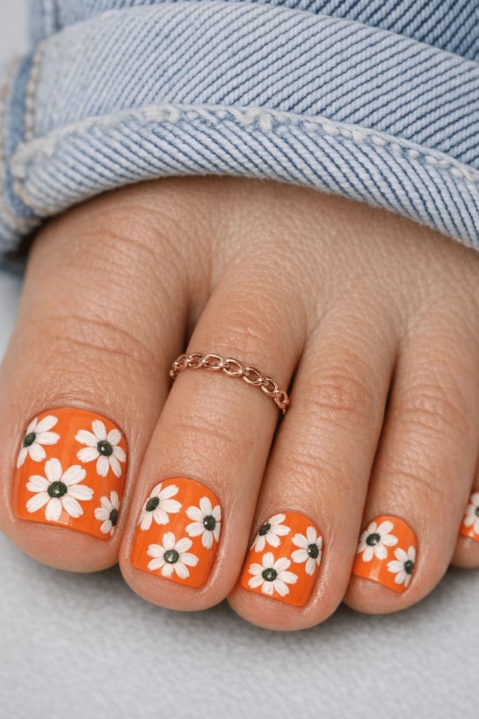 15. Orange Daisy Floral Spring Toe Nail Design with Retro Charm