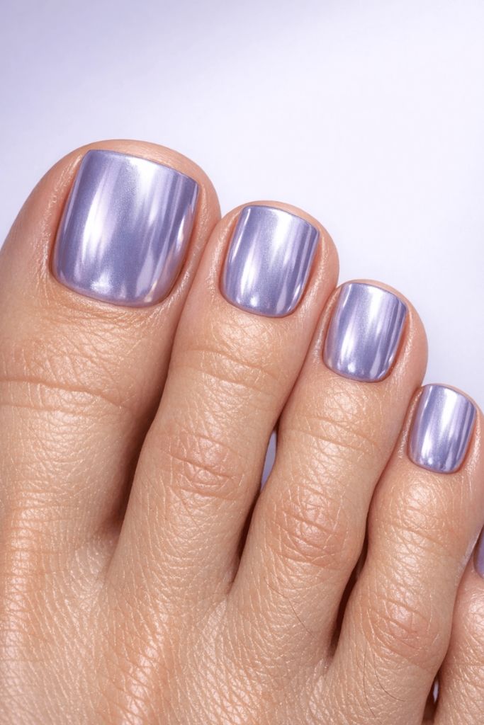 Now here’s where spring toe nail colors for 2026 take a decidedly modern turn. This metallic, chrome-finish lavender is unlike anything else on this list — it reflects light like a mirror, shifting between silver, lilac, and cool violet depending on the angle. The finish is so smooth and reflective that each toenail looks like a tiny piece of polished metal, and the effect is futuristic without feeling cold. It’s the intersection of pastel softness and chrome edge, and it’s absolutely stunning.