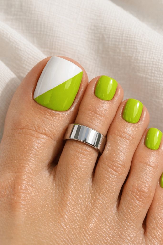 This is where spring toe nail designs for 2026 start getting interesting. A vibrant chartreuse-lime base on most toes, with a diagonal white-and-green color-block accent on the big toe — it’s architectural, fresh, and undeniably cool. The silver toe ring adds a touch of polished hardware that elevates the whole look from fun to fashion-forward. There’s a confidence in choosing lime green that I deeply respect.