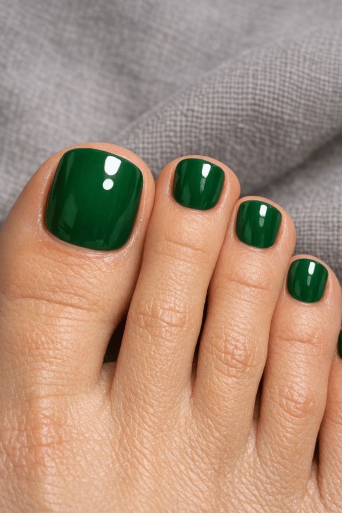 13. Deep Forest Green Spring Toe Nail Color with Glossy Richness