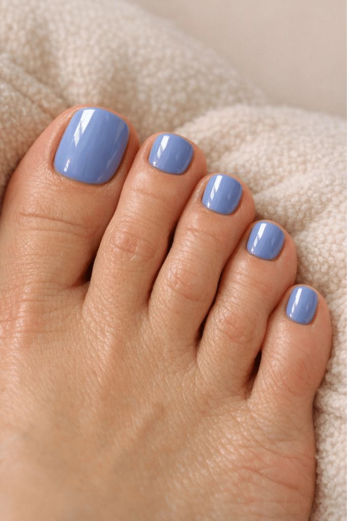 Moving into one of the most wearable spring toe nail colors of 2026 — this periwinkle blue is pure serenity in a bottle. Not quite lavender, not quite cornflower, it lands in that perfect blue-violet middle ground that feels both calming and fashion-forward. The glossy finish gives it a juicy, almost gel-like quality, and the color reads differently in every light — bluer in shade, more violet in sun. It’s endlessly interesting.